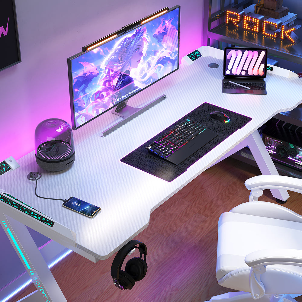 The table legs are made of 3*6 carbon steel pipe with a thickness of 0.9MM. Laser cutting and welding technology are employed for material processing and welding, ensuring an error margin of no more than 0.5MM. The legs undergo high-temperature powder coating to prevent scratches and enhance gloss. The desktop is equipped with RGB armor lighting, which strengthens the desktop's texture. The leg lighting design further enhances the esports gaming atmosphere, with 72 adjustable light colors to meet most consumers' needs. The LEDs come with built-in W2812ic, and the motherboard supports sync control. The lights can change color in sync with music rhythms. Adjustable foot pads are included to prevent floor scratches and address uneven floor issues. The desktop uses 16MM eco-friendly particle board, with a carbon fiber texture surface for slip resistance, durability, and texture. All four corners are rounded to prevent bumps. The ergonomic design ensures comfort by eliminating abdominal pressure. When fully assembled, the table can support up to 600 pounds, meeting most consumers' load-bearing requirements.