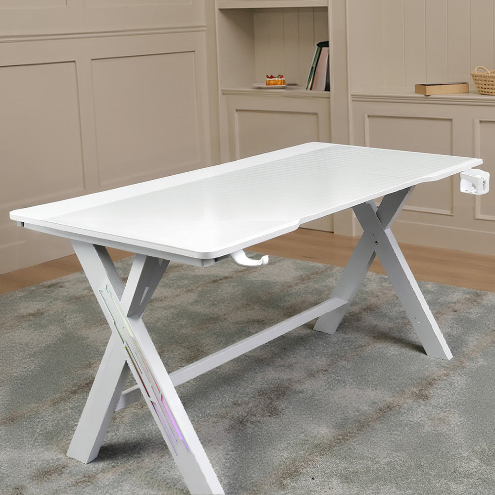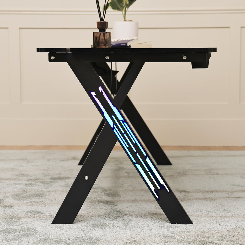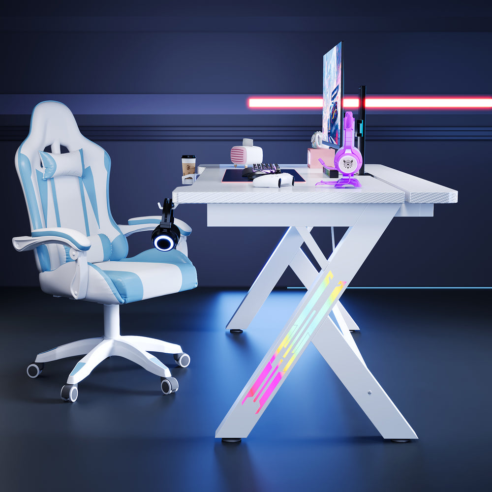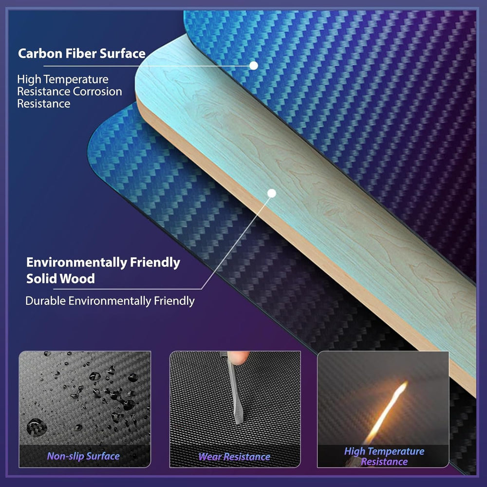 The table legs are made of 4*8 carbon steel pipes with a thickness of 1.2MM, featuring a two-stage partition design for easy cable management and mechanical arm installation. Laser cutting and welding technology are employed in the material processing and welding processes, ensuring an error margin of no more than 0.5MM. The legs undergo high-temperature powder coating to prevent scratches and enhance gloss. The lighting design further enhances the esports gaming atmosphere, with 72 adjustable color options to meet most consumer needs. The LED beads come with built-in W2812ic, and the motherboard supports synchronized lighting control, allowing color changes in sync with music rhythms. The tabletop is made of 18MM eco-friendly solid wood panels, meeting E0 environmental standards. The surface is treated with carbon fiber texture for slip resistance, durability, and texture. All four corners are rounded to prevent bumps and collisions, and the ergonomic design ensures comfort by eliminating abdominal pressure. When fully assembled, the table can support up to 600 pounds, meeting the load-bearing requirements of most consumers.